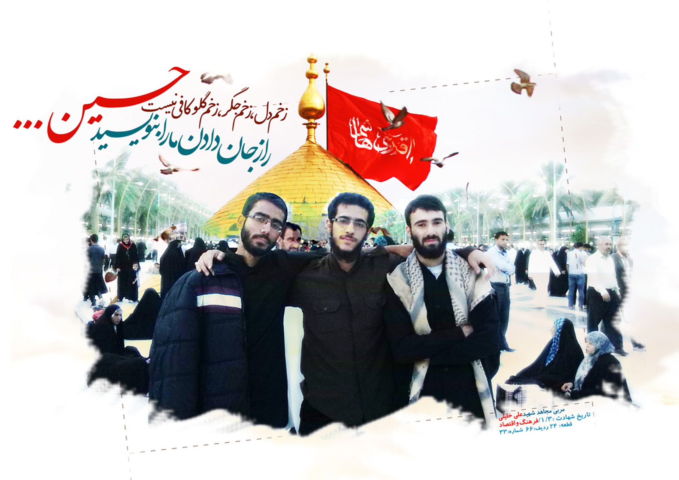 به مناسبت چهلمین روز درگذشت طلبه بسیجی، شهید امربه معروف و نهی از منکر، شهید علی خلیلی مجموعه 6 طرح تقدیم به مسجدیان عریز میشه. این طرحها هدیه رفقای مسجدی مسجدنما است و امکان چاپ در اندازه A4 و رنگی و سیاه و سفید برای سه طرح وجود داره. سه طرح دیگر هم مناسب برای استفاده بعنوان زمینه صفحه نمایش (والپیپر) است. برای مشاهده تصاویر در اندازه اصلی روی آن تقه بزنید (کلیک کنید)